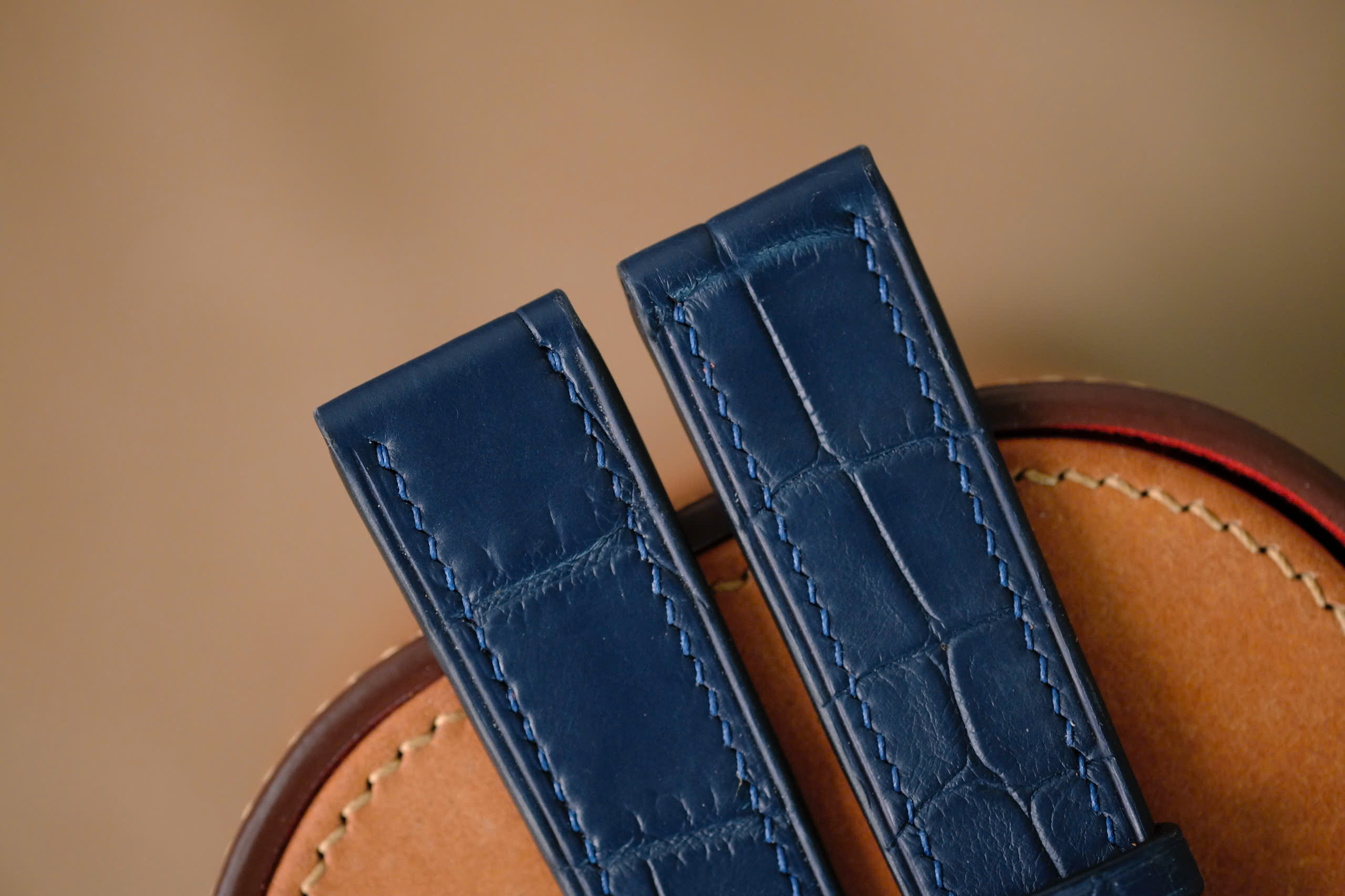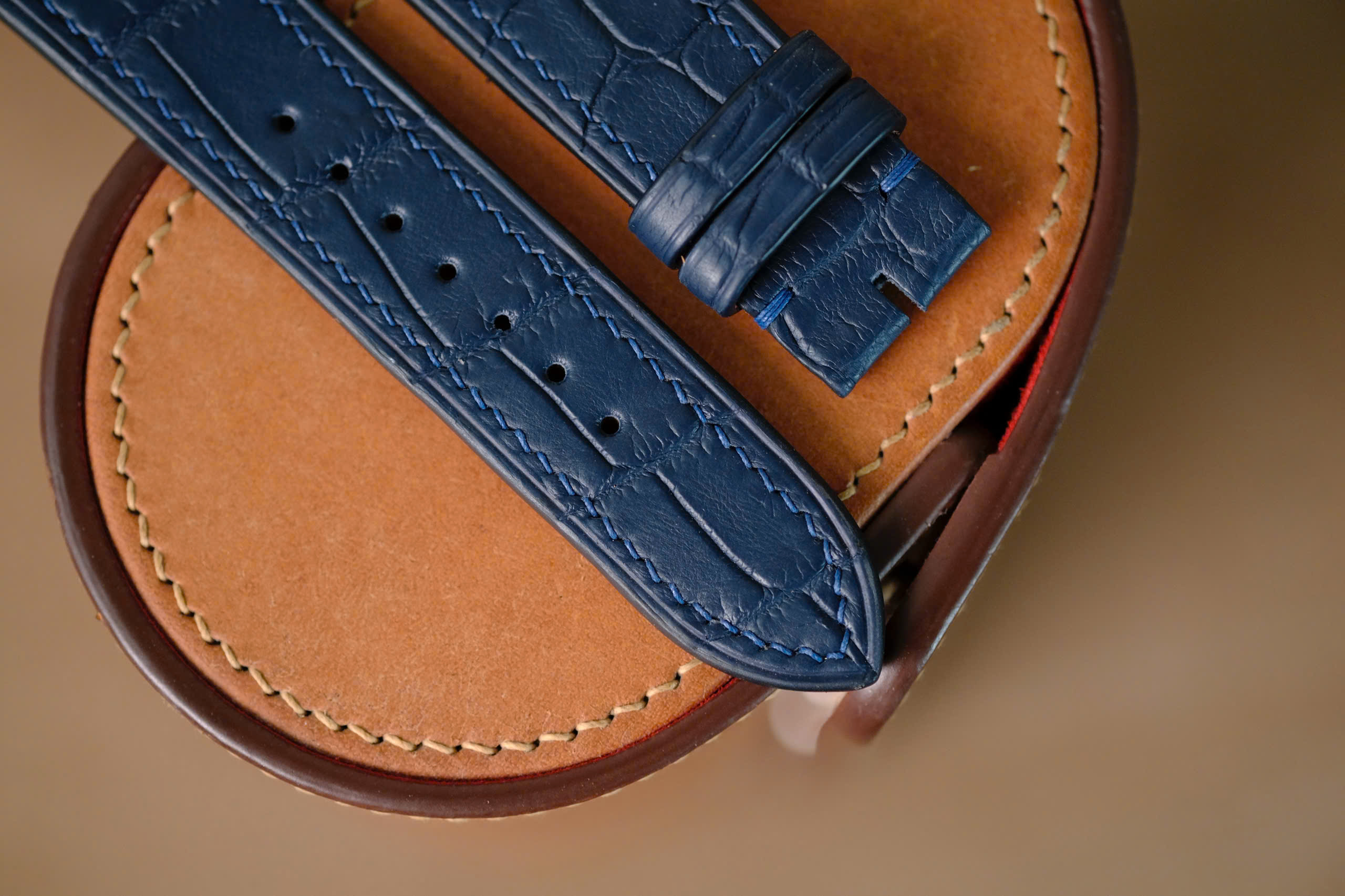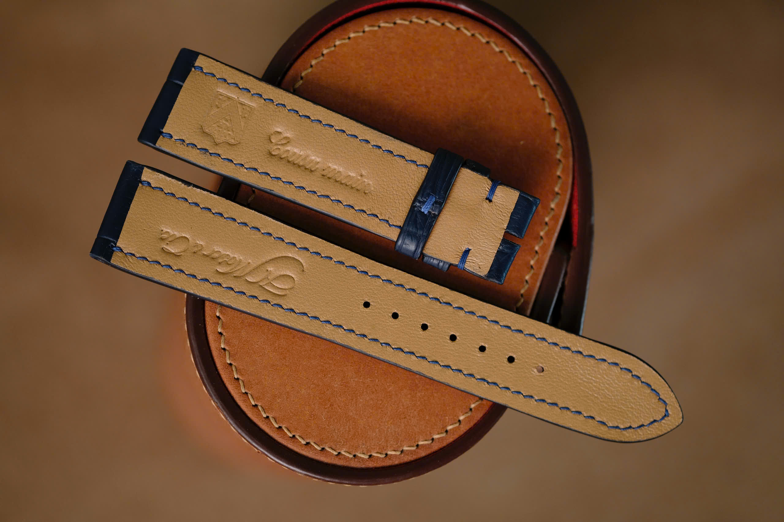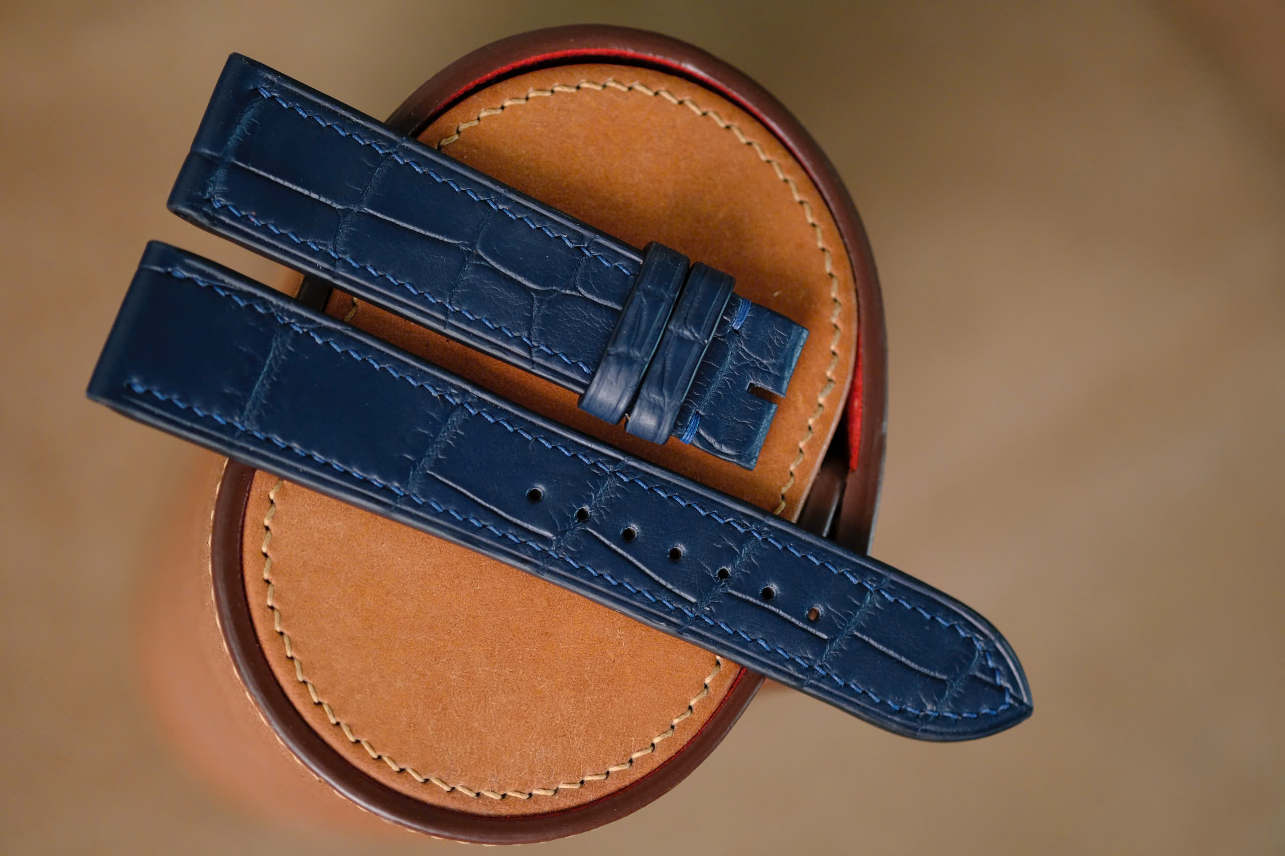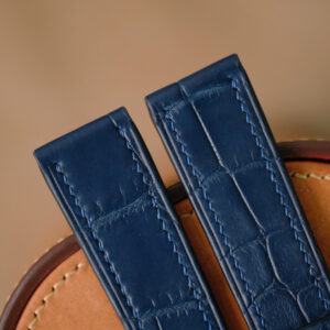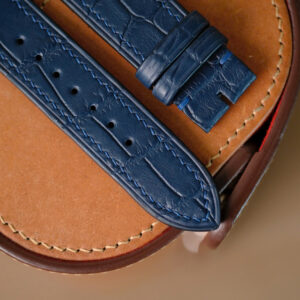 Handmade navy blue Crocodiles strap for H Moser & Cir watch size 20/18 (or any size). The default size is 20/18 (20mm at the lug, 18mm at the bucke side). I can change to any size: 22-18, 22-16, 21-18, 21-16, 20-18, 20-16, 19-16, …… The default length is 115/75. I can change the length shorter or longer to fit you wrist. I can change size, length, thickness, stitching color if you want.