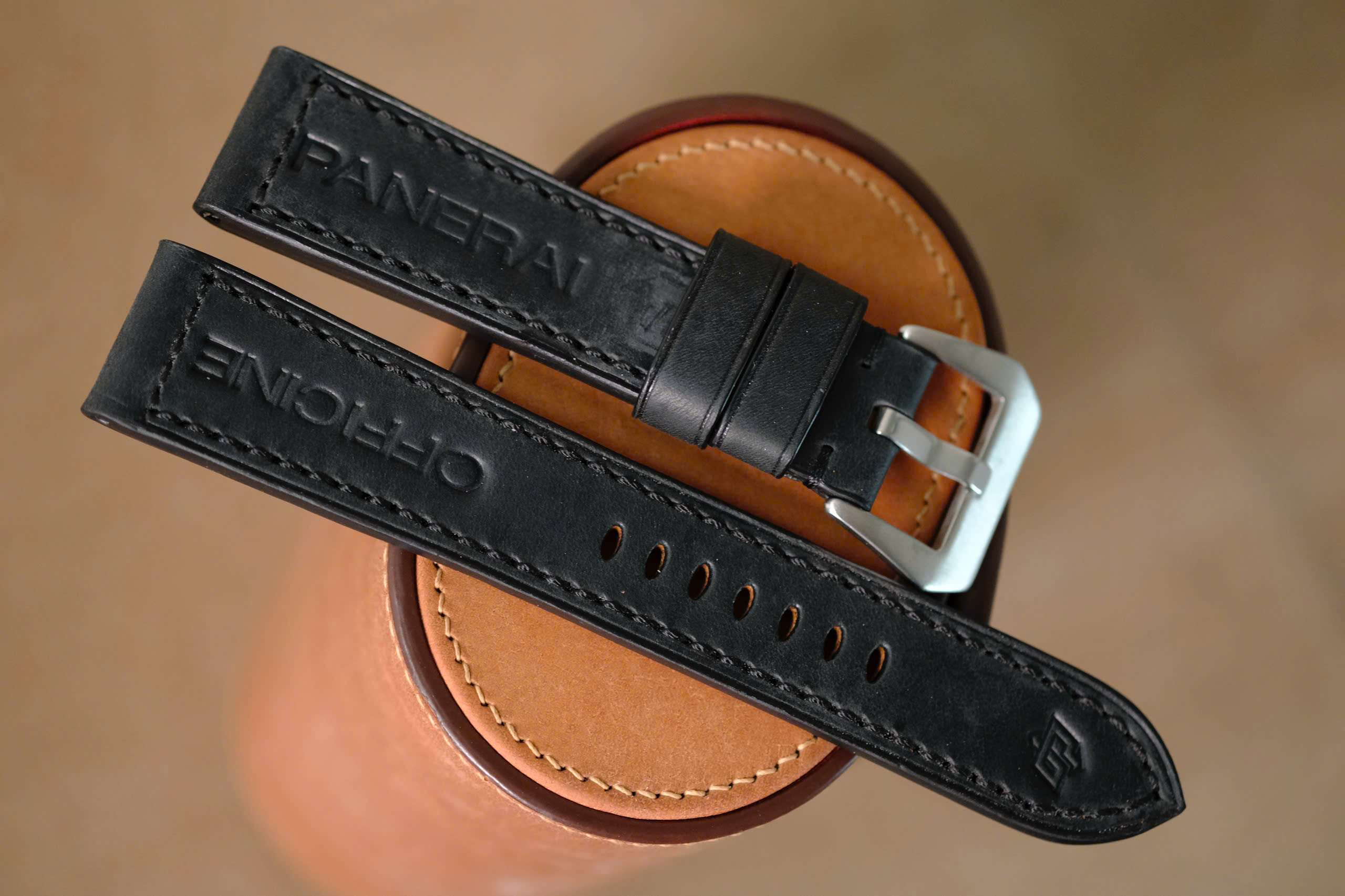 Handmade black strap for Panerai size 24/22. The default size is 24/22 (24 mm at the lug, 22mm at the bucke side), the silver PIN buckle as image included. I can change to any size: 27-24, 27-22, 26-26, 26-24, 26-22, 24-24, 24-22, 22-22,  22-20, …… The default length is 120/75. I can change the length shorter or longer to fit you wrist. I can change size, length, thickness, stitching color if you want.