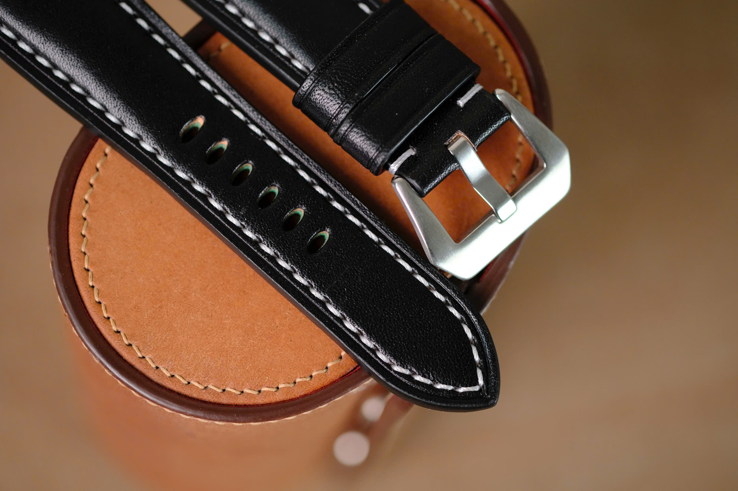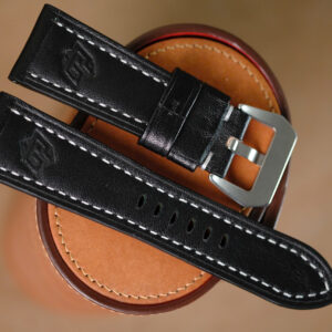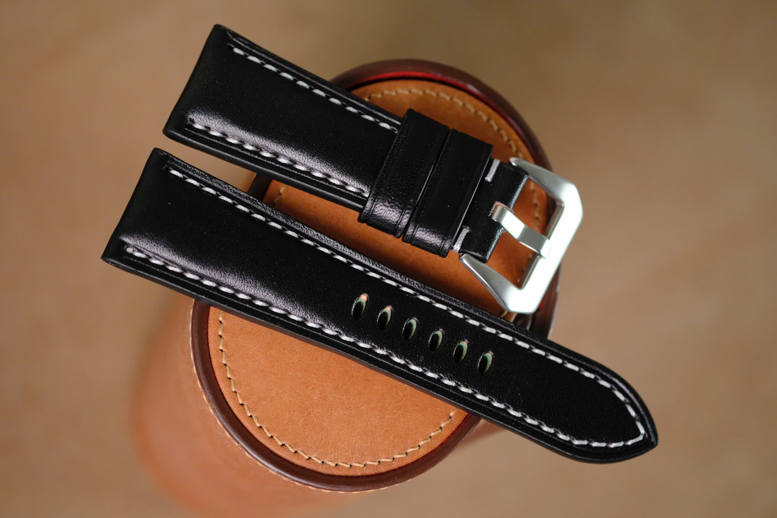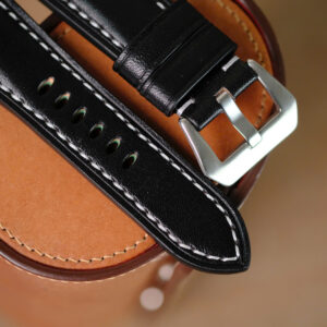 Handmade black strap for Panerai size 24/22 with white stitching. The default size is 24/22 (24 mm at the lug, 22mm at the bucke side), the silver PIN buckle as image included. I can change to any size: 27-24, 27-22, 26-26, 26-24, 26-22, 24-24, 24-22, 22-22, 22-20, …… The default length is 120/75. I can change the length shorter or longer to fit you wrist. I can change size, length, thickness, stitching color if you want.
