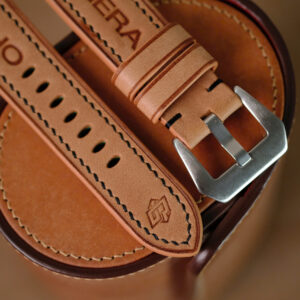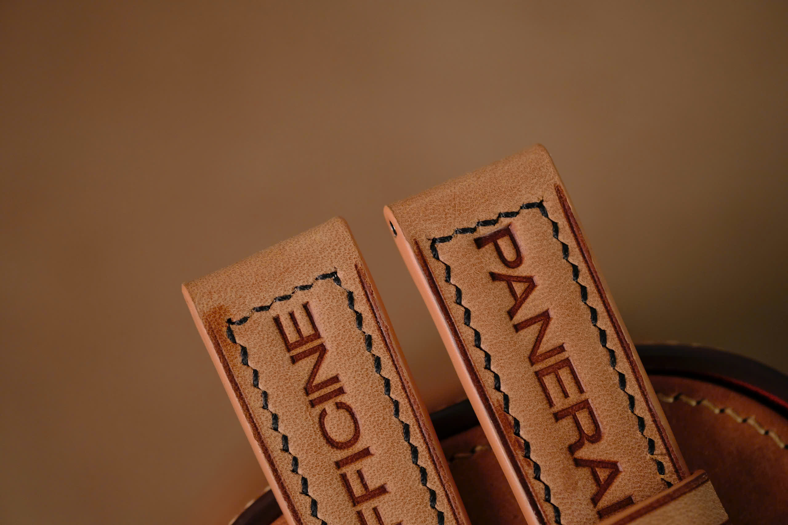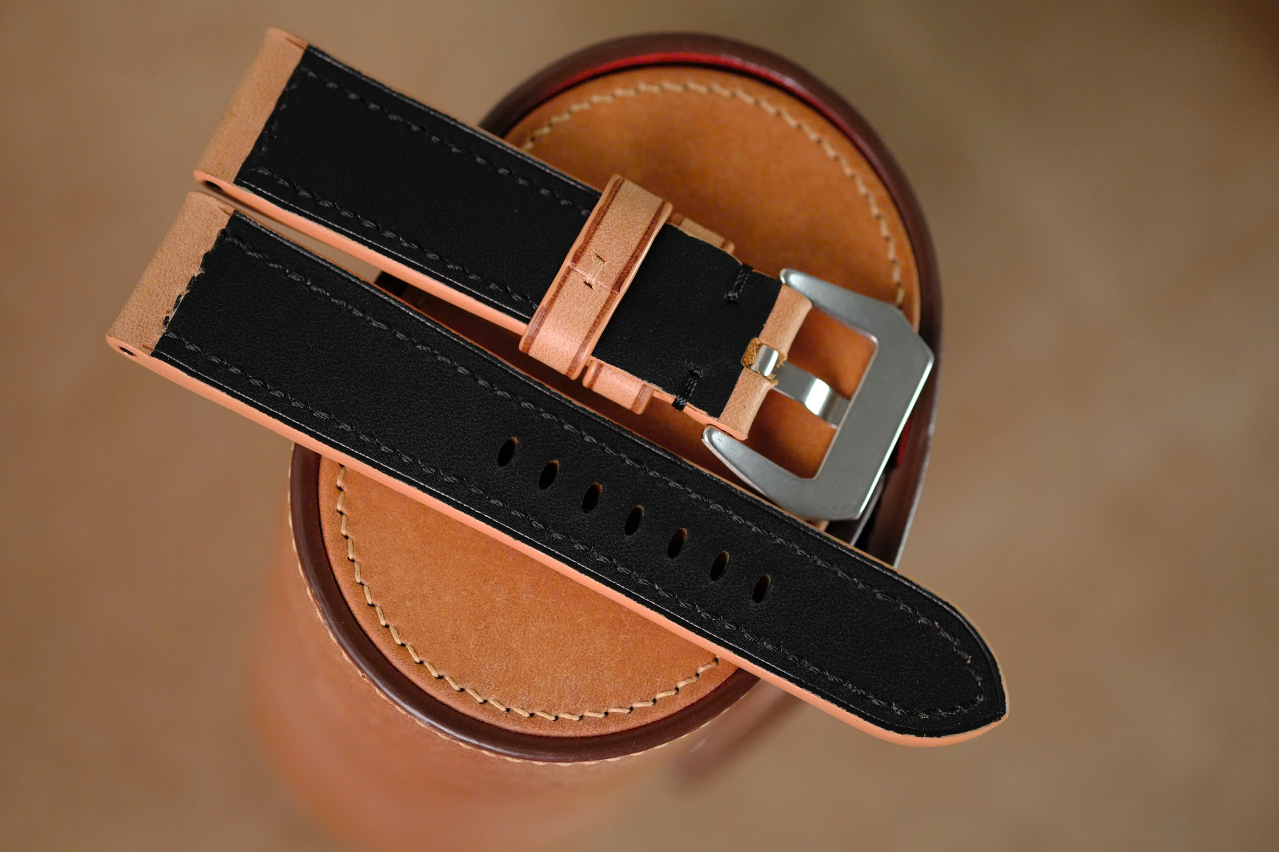 Handmade TAN Pueblo strap for Panerai size 24/22 with black color stitching. The default size is 24/22 (24 mm at the lug, 22mm at the bucke side). I can change to any size: 27-24, 27-22, 26-26, 26-24, 26-22, 24-24, 24-22, 22-22, 22-20, …… The default length is 120/75. I can change the length shorter or longer to fit you wrist. I can change size, length, thickness, stitching color if you want.